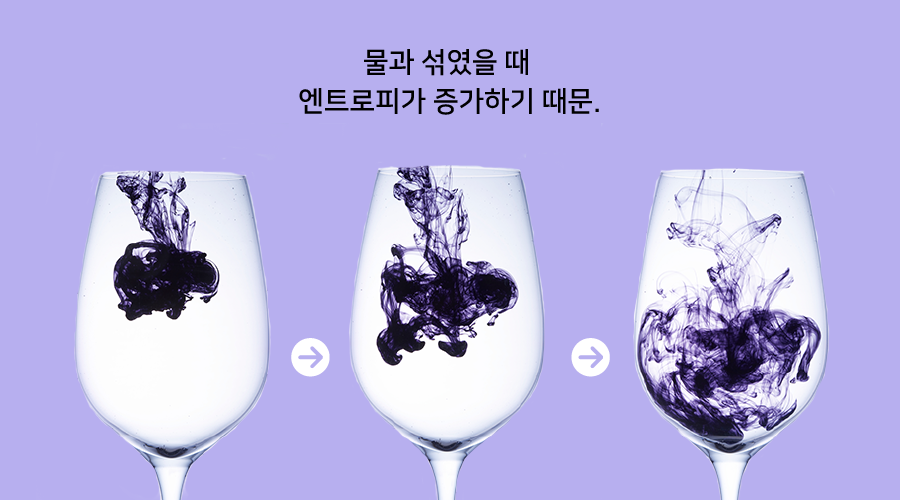 열역학 제2법칙을 설명하기 위해 흔히 활용하는 사례로 물속에 떨어뜨린 잉크를 자주 소개한다. 잉크 방울을 물속에 떨어뜨리기 전에는 검정 잉크와 물은 전혀 별개의 물질로 독립적으로 존재하지만, 잉크 방울을 물속에 넣는 순간, 검은색 잉크 방울은 물속에서 무질서하게 번져나간다.
