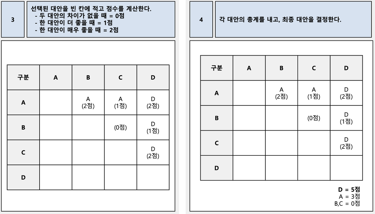 대안들 간의 비교를 통해 중요도 순으로 우선순위를 정할 수 있다.