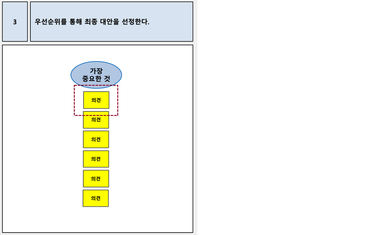 대안 선정의 기준(예 : 중요도, 긴급성, 실현가능성 등)이 명확할 때, 사용하면 효과적임