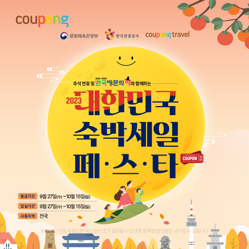 추석 연휴 및 한국 방문의 해를 맞아 쿠팡에서 '2023 대한민국 숙박세일 페스타'를 진행하고 있습니다. 이미 9월 27일부터 진행 중인 이벤트인데요.
