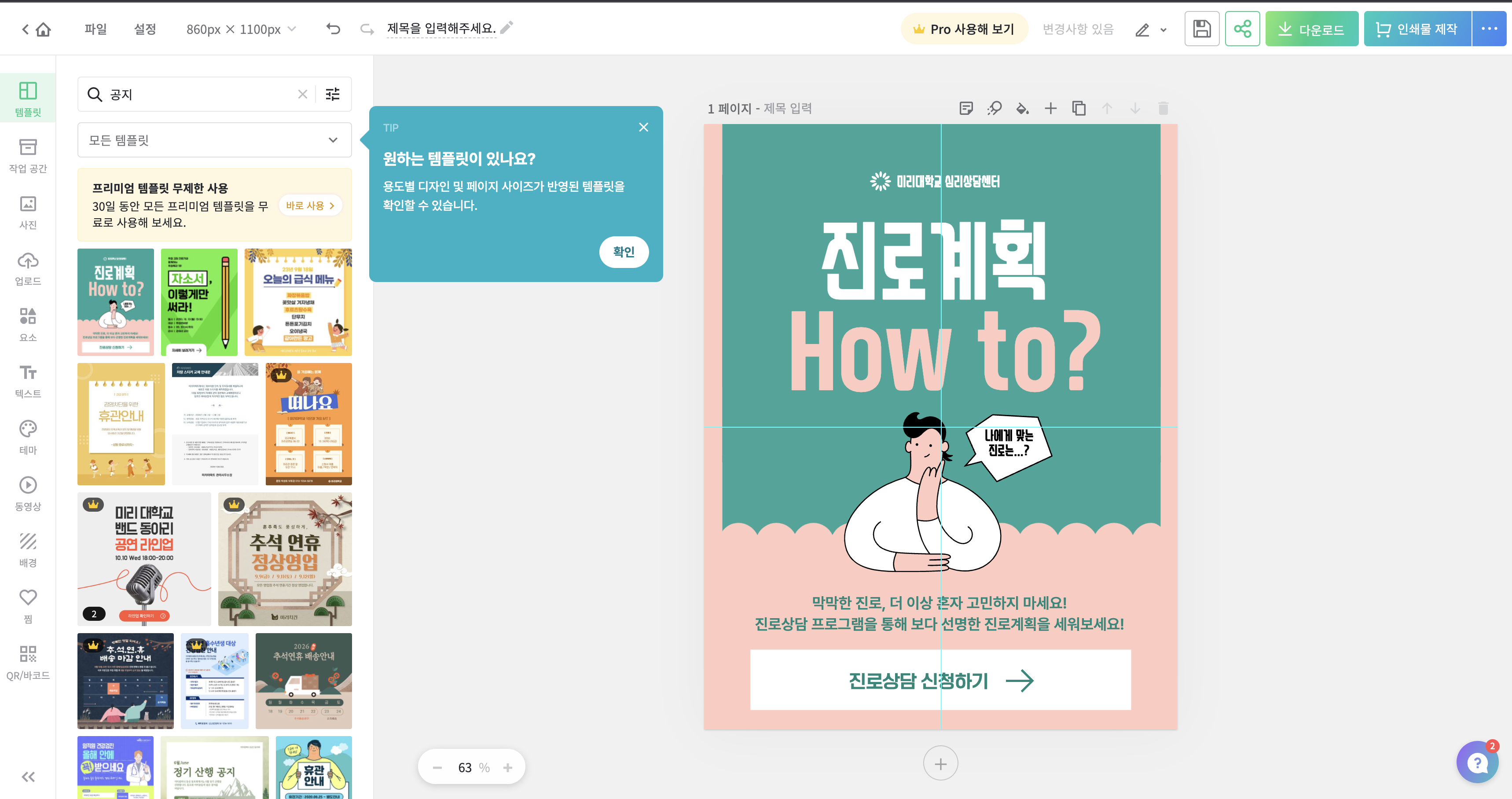 미리캔버스는 알게 된 이후로 정말 자주 쓰는 플랫폼이다. 유료 템플릿도 있지만, 기본적으로 저작권에 문제 없는 다양한 무료 템플릿을 제공하며, 가로형, 세로형, 카드형, 포스터형, 웹페이지형 등 다양한 형태의 프레임을 제공한다. 뿐만 아니라 연관 키워드 입력을 통해 유저가 사용하고자 하는 기본 템플릿을 검색하기에 용이하며, 잘 디자인된 기본 템플릿에 유저가 몇 가지 텍스트 수정과 이미지 크기/위치 등만 수정해서 바로 추출(이미지, PDF 등)이 가능하다. 이 툴만 있으면, 굳이 전문 디자이너의 도움을 받지 않아도, 스스로 멋지게 디자인 된 포스터나 안내문 등을 만들어 낼 수 있다.