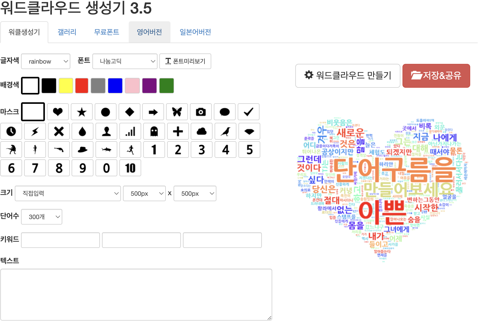 아마 우리나라에서는 가장 많이 검색해본 워드클라우드 사이트가 아닐까 싶습니다. 기본적으로 한국어가 잘 인식되고, 사용하기에 매우 편리합니다.